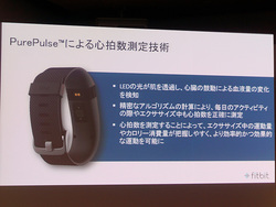 同技術ではリストバンド裏側から出るLEDの光が肌を透過して血液量の変化を感知。これを元に心拍数を計測する。これにより従来の心拍数センサーのように胸部にセンサーを取り付けるなどせず、手首だけでの心拍数計測を可能にしたという。