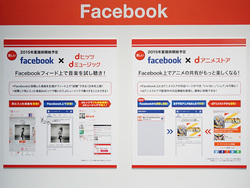 NTTドコモは、Facebookとの連携を強化。「dヒッツ」で気に入った楽曲をFacebookでシェアして知人に直接試聴してもらえるようにしたり、「dアニメストア」において作品ページを検索して「いいね!」や「シェア」が簡単に行えるようにする。また、ローソンとも業務提携することも発表した。