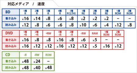 書き込み速度は、「オーバースピード書き込み機能」とSATA接続により、1層BD-Rで最大16倍速を実現した。ハイビジョン映像などの大容量データも約9分で書き込みが可能だという。DVDやCDの他、BDXLメディアやM-DISCにも対応している。