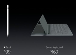 大画面を使って、フルサイズのソフトウェアキーボードが使用可能だが、同社幹部のフィル・シラー氏は「ハードウェアキーボードが求められる場面もある」とし、カバー一体型のキーボード「スマートキーボード」を紹介した。オプションとなり、価格は169ドル。
