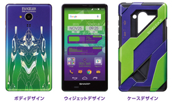 端末は、メタリックな初号機カラーのグラデーションの中に初号機が浮かび上がる特殊な加工を施した特別なデザインを採用。また、「スタジオカラー」のアニメーターが特別に描き下ろした限定デザインを含む、365枚というボリュームの壁紙を格納したオリジナルアプリケーション『365EVAWALL』を搭載。初期表示は9種だが、毎日新しい壁紙が追加されていく。