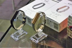 新製品のRAYはブレスレット型で、MISFIT初となる円柱の形状をしたモデル。腕時計やバングルなどのファッションアイテムとのコーディネートを意識したミニマルでシンプル、スタイリッシュなデザインに仕上がっている。カラーはカーボンブラックとローズゴールドの2色で、スポーツバンドモデルおよびレザーバンドモデルが用意されている。8mmの時計用バンドで着せ替えが可能なので、ユーザーオリジナルのRAYにアレンジすることもできる。
