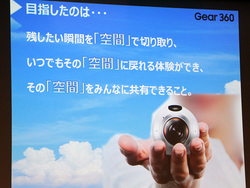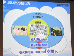 Gear 360の製品テーマは「思い出の残し方を変える」。これまで写真など平面でしか残せなかった思い出のワンシーンを、360度の「空間ごと」残せるようにするものだと同社はアピールする。