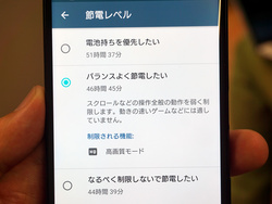 また、使える機能を絞ることでバッテリーを長持ちさせるSTAMINAモードは、3段階からレベルを選択できるように進化。「電池持ちを優先させたい」「バランスよく節電したい」「なるべく制限しないで節電したい」という3段階の節電レベルを選択できる。