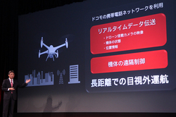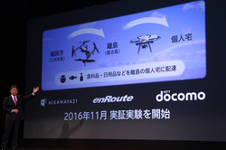 また、ドローンを使ったサービスは、ドコモの携帯電話ネットワークを利用。これにより従来電波のやりとりが難しかった地域でもデータ伝送や機体の通信制御を行うことが可能になるとのこと。「長距離での目視外運航が可能になる」(吉澤氏)。同社は「無人航空機における携帯電話の利用に関わる実用化試験局の免許」を神奈川県、千葉県、福岡県の一部地域で取得。今年11月に福岡市で実証実験を開始。市内から離島(能古島)、そして個人宅への配達テストを行うとのことだ。なお、目視外飛行についての法制度設備はまだのため、飽くまでも実証実験であることが強調された。