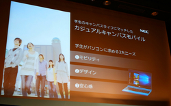 続いてLAVIE Note Mobileについて、森部氏は「学生をターゲットとした商品開発ということで、”カジュアルキャンパスモバイル”をテーマとしている」と製品コンセプトを紹介。