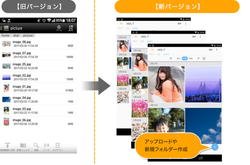 今回のバージョンアップで、iOS/Android版ともにアプリの操作画面をリニューアル。これまでの黒を基調としたデザインから白を基調としたデザインへと変更された。ファイル一覧に「写真」「音楽」表示モードを追加し、フォルダ内の写真・音楽ファイルのみを表示させられるようになった。また、写真ファイルはサムネイルのサイズを3段階から選択可能。さらに、名前・日付・サイズでグループ表示されるようになり、よりデータを探しやすくなっている。