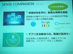 独自AI「センス・コンパニオン」は端末の利用状況を学習する。西村氏は一例として、使用しないアプリをタスクキルしてバッテリー消費を抑えるといった機能をあげていた。同時に音声認識AI「Google Assistant」を搭載し、後日のアップデートで「Amazon Alexa」にも対応する。これにより「Amazon Echo」と同等の機能を備えるようになるという。こういった機能に関して西村氏は「ある種、スマートフォンの範疇を超えつつあると言えるのでは」と述べた。