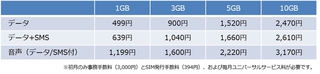 契約は「データ通信のみ」「データ通信+SNS」「データ通信+音声通信」の3種類。データ通信上限は1GB、3GB、5GB、10GBの4プランが用意される。また、「App store」「LINE」「Pokemon GO」の3つのアプリに関しては通信料が発生せず、3GBプラン以上の契約者についてはさらに「Facebook」「Twitter」「Instagram」「Messenger」の4アプリが通信料無料になる「SNSカウントフリー」を採用している。
