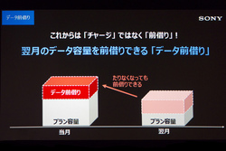 「データ前借り」機能は事前に追加で利用したいデータ容量を購入しておくというチャージ方式ではなく、足りなくなった場合にのみ申請することで翌月のデータ容量を使えるという業界初の試み。「月末に少しだけデータ通信容量が足りなくなる事が多い」とのユーザーの声を受けて決定したという。最少10MB、以降1MBきざみで翌月のデータ容量を前借りでき、あまったデータ容量に関しては従来通り翌月に繰り越すことが可能。他ユーザーと通信料を分け合う「パケットギフト」とも併用できるため、これまで以上にユーザー個々人にあった利用ができるとしている。