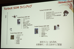 続いて登壇した今井氏が指揮を執るサンダーソフト社は、Snapdragonを用いたリファレンスデザイン「TurboX」プラットフォームを開発しており、ドローン、ロボット、カメラ、VRゴーグルといった個々の製品それぞれにあわせたモジュールが用意されている。