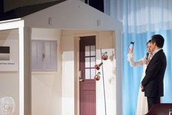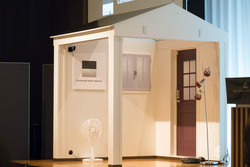 続いて壇上に用意されたデモハウスでは、スマートフォンに話しかけるとデモルームの玄関の鍵が開くと同時に、照明、扇風機やロボット掃除機が動作を始めるというコネクティッドホームのあり様が実演された。