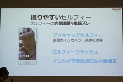 背面カメラは広角16.4Mで、画質エンジンの性能向上により肉眼に近い映りを再現。前面カメラはディスプレイ内部に設置したことに加え、視線がカメラに向くようUIを調整。セルフィーの大敵である視線ズレを対策した「アイキャッチセルフィー」となっており、小林氏は「AQUOS史上もっともセルフィーが撮りやすいモデル」とした。