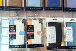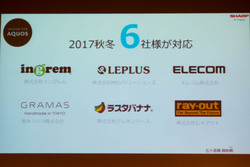 会場では新モデルの他、同社がIoT施策の一環として提供するサービス「COCORO +」や、AQUOS用アクセサリーが発表。純正アクセサリーとして、AQUOSの画面に曇りガラスのようなエフェクトを表示してプライバシーを守るフリップ式ケース「Frosted cover」、サードパーティー6社とコラボレーションして開発し、統一されたロゴで販売する「DESIGN FOR AQUOS」アクセサリーを出展していた。