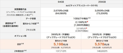 これにデータ利用量に応じて自動的に定額料が変動する「auピタットプラン」を組み合わせると、64GBモデルの場合、当初1年間は毎月5,198円からの支払額で購入できる。2年目以降は6,278円/月となる。