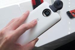 「Moto360カメラ」は4K画質で360度の動画/静止画撮影が可能なカメラ。「Moto Z」側に専用アプリをインストールすることで、画像編集やSNSへのライブストリーミング配信にも対応し、同社は「SNS向けのアクセサリー」としている。
