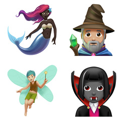 アップルでは「これまでよりも表情豊かな笑顔マーク、性別によらないキャラクター、服装の種類、食物の種類、動物、想像上の生き物などが使えるように」なる、としている。