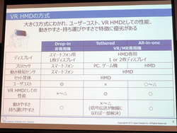 現在、VR HMDはスマートフォンを装着するタイプ、PCやゲーム機などと接続するタイプ、プレーヤー機能も内蔵するオールインワン型の3種類があり、それぞれに一長一短がある。ディスプレイという面から見ると、ユーザーの目や脳に負担をかけないHMDが求められるが、現在のスマートフォンのディスプレイでは不十分だと同社は説明。今後のさらなるVRの普及にはスマートフォンディスプレイをVR向けに改良するか、VR専用機が必要だとした。