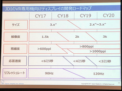 こうした背景を受け、同社はディスプレイの高画素密度を実現。VR用途に適したIPS液晶でディスプレイを開発したという。また、2018年度後半〜2019年度以後には2インチ台で1,000ppi超、リフレッシュレート120Hzのディスプレイも開発予定だとしている。