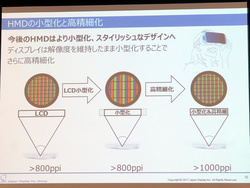 現在、同社では651ppiのHMD向けLTPS TFT LCDを量産化済みだが、レンズ越しに見たときに画素の固定パターンが見える場合があり、800ppi以上のさらなる高精細ディスプレイが望まれていたとのこと。また、HMDの小型軽量化のためにはディスプレイを小さく、レンズ倍率を大きくする必要があり、1,000ppi以上の高精細への要求が高まっているという。