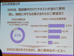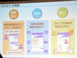なお、藤間氏は「+メッセージはLINEへの対抗というわけではなく、携帯電話のメッセージサービスの正常進化という位置づけだ。対抗という意識はない」とコメント。ドコモでは主なターゲット層として、現在SMSを頻繁に利用する傾向が高い中高年層やビジネスユーザー層を想定しており、若年層ユーザーが多いとみられるLINEと住み分けられる考えを示した。