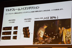 カメラ自体は、Galaxy史上最も明るいF値1.5のレンズを搭載した「スーパーローライトカメラ」を採用。周囲の明るさに応じてF値を1.5か2.4に自動変更し、ピントや光量も最適化する「デュアルアパチャー機能」や、12枚の画像を合成することでノイズを低減する「マルチフレームノイズリダクション機能」を搭載。さらに光学ズーム、光学手ぶれ補正機能も備え、ズーム時の画質向上も図っている。