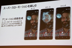 SNSに特化した点として、スーパースローモーション動画を撮影すると自動で3パターン(リバース/ループ/スイング)のGIFアニメを作成。製品説明に登壇したサムスン電子ジャパン(株)プロダクトグループ・課長 大越 一博氏は、「GIFアニメとすることでファイル容量を抑え、より手軽にSNSへ投稿できる」と語った。