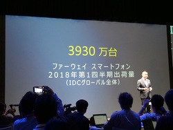 発表会では冒頭、ファーウェイデバイス 日本・韓国リージョンプレジデントの呉波(ゴハ)氏が登壇。2018年第1四半期に、同社のスマートフォンの出荷台数が3,930万台となり、前年比13%増となったことをアピールした。またフォーブスのブランドランキングが79位となったほか、2017年の研究開発費が世界第6位と、アップルよりも多いことなどを紹介していった。