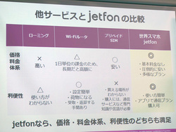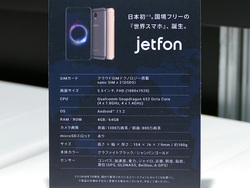 なお、今回の新モデルおよび新サービスはFREETELブランドではなく、jetfoneブランドでの展開。「本機は日本初の“国境フリー”技術搭載端末。そういった理由から、格安スマホとして成長してきたFREETELブランドとは別のブランドでの展開にした」(井上社長)という。