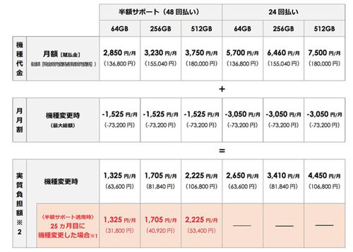 機種代金は、半額サポート(48回払い)と、24回払いの2パターンを提示している。なお半額サポート(48回払い)は25ヶ月目に、使っている機種と引き換えに指定機種へ機種変更することが前提となるサービス。