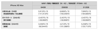 iPhone XS Maxの料金は、一括支払いの場合は141,912円(64GB)、160,056円(256GB)、184,680円(512GB)。24回払いの割引を差し引いた実質負担金額は、64GBが3,456円/月(総額82,944円)、256GBが4,212円/月(総額101,088円)、512GBが5,238円/月(総額125,712円)となる。