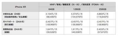 iPhone XRの料金は、一括支払いで98,496円(64GB)、104,976円(256GB)、116,640円(512GB)。24回払いの割引を差し引いた実質負担金額は、64GBが1,647円/月(総額39,528円)、256GBが1,917円/月(総額46,008円)、512GBが2,403円/月(総額57,672円)となる。