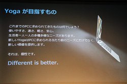 河島氏は「2012年に販売開始して以来、世界中でYogaシリーズの製品が普及し、ブランドとして確立してきたと実感している。今後はシリーズのコンセプトでもある “Diffrent is better” =自分の個性を表現できるPCというスピリットを、レノボ製品全体に継承していくべきと考えて拡張する事となった」と語る。
