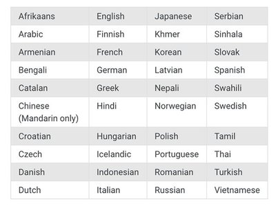 サードパーティー製ヘッドホンでは、ボーズの「QC35II」、ソニーの「WH-1000XM3」(前機種も対応)、JBLの「EVEREST GAシリーズ」などがGoogleアシスタントに対応しており、これらの機種でもGoogleのリアルタイム翻訳が使用できる、と解釈できる。翻訳に対応している言語は以下の画像の通り。