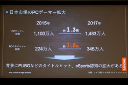 発表会では、日本でのPCゲーミングユーザーについても言及。2015年からの2年間で日本のPCゲーム人口は1.5倍になっているという。またeSportsの参加者数はここ1年間で1.4倍、ゲーム配信サービス「Twitch」の視聴者数が世界第3位であることも挙げた。