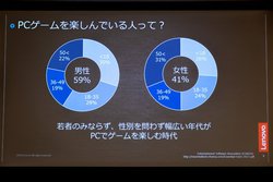 発表会ではアメリカでの調査データを映し、性別にかかわらず幅広い年代でPCゲームを楽しんでいることを説明。同社社長のデビット・ベネット氏も自宅では、子供とのコミュニケーションツールとしてPCゲームを楽しんでいることを明かし、プロゲーマーからカジュアルゲーマーまで多くのゲーマーへPCゲームの楽しさを伝えていきたいと話した。