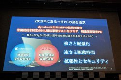 なお、三氏のあいさつの中で共通して語られた、注目の“シャープのAIoTサービスとの連携”について、石田会長は「これから」と語り、今回の発表会では具体的な姿は示されなかったが、「いろいろなものがつながってより便利になっていく。もっと新しいものを展開していくことができれば、そこが大きなチャンスになる」と指摘。DynabookとSHARPの融合が産み出す化学反応に大きな可能性を見いだす。