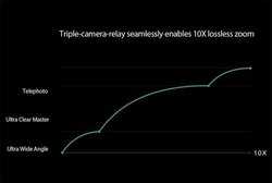 この新技術を実現するため、「超ワイドアングル + 超クリアマスター + テレフォト」で構成されるトリプルカメラソリューションを開発。3台のカメラが連動して動作してリレー方式で画像を処理することで10倍ズームを実現する。