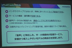 続いて同社執行役員 事業戦略本部 企画開発部 部長・加藤光兼氏が、音声配信サービス「PlatCast」と「eスポーツ」の2つの新しい取り組みについて説明した。