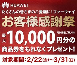 ファーウェイ、スマホ購入で最大1万円の商品券がもらえるキャンペーン。3月31日まで