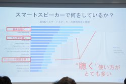また、2018年度に行った調査ではスマートスピーカーは音楽/ラジオ/朗読など “聴く” 用途に使用されていたことから、音質も重要な要素であると判断。Harman Kardon監修のスピーカーユニットを採用することで音質の向上を図った。前田氏は、この3in1により好きな場所で “聴く” コンテンツを高音質で楽しめ、さらにその周囲に高品質なネットワーク回線を提供できるという本製品の利点を説明した。