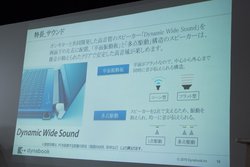内蔵スピーカー「Dynamic Wide Sound」は従来モデルから引き続きオンキヨーと共同開発を行ったもので、ディスプレイ下部の左右に配置。指向性や音ヌケの改善を図っている。内部構造も、中心部から外縁までタイムラグ無く振動する平面振動板と、ユニットを2か所で支持する多点駆動構造を採用し、クリアで安定した高音域を追求した。また、DTSと共同開発した音響制御ソフトウェア「DTS Audio Processing」を搭載し、コンテンツに合わせた音響設定を可能とする。