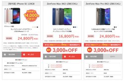 端末の一例として、「AQUOS zero SH-M10」が10,000円引きの77,800円(以降すべて税抜)、「ZenFone 5 (ZE620KL)」が22,000円引きの17,800円で販売。また海外仕様のアウトレット品だが、「iPhone SE」の128GBが14,000円引きの24,800円で販売される。