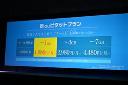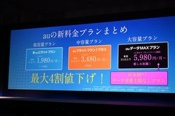 KDDI、沖縄セルラーは、『新・値下げプラン』として料金プラン「auデータMAXプラン」「auフラットプラン 7プラス」「新auピタッとプラン」を発表した。また家族3人以上で月1,000円を割り引く「家族割プラス」も提供される。