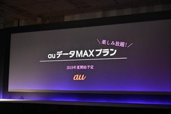 「次世代に向けた楽しみ放題の新料金」として、4G LTEとして日本で始めてとなる無制限のプラン「auデータMAXプラン」も発表。データ容量に上限のないスマートフォン向けの料金プランとして、2019年夏以降に提供開始予定としている。