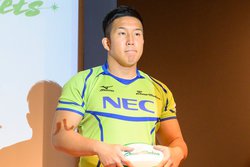 また発表会では、ラグビーチーム「NECグリーンロケッツ」より大和田 立選手が登場。実際に製品にタックルを行い、新素材を採用した天板の強度をアピールした。