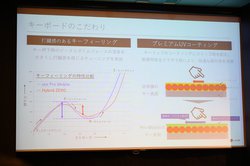 さらにキーボードの表面にはさわり心地と高耐摩耗を実現したという「プレミアムUVコーティング」が施される。従来の耐摩耗を実現するコーティングにスリップ剤を加えることで、さらさらとした触感のキーボードを実現したという。