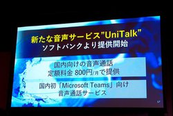 日本マイクロソフトとソフトバンクは、次世代コミュニケーション分野で戦略的パートナーシップの締結を発表。両社共同の新サービスとして、「Office 365」のコラボレーションツール「Microsoft Teams」の定額音声通話サービス「UniTalk」を、8月1日より提供開始する。