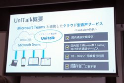 UniTalkは、Microsoft Teamsのユーザーごとに固定電話番号を割り当て、1番号あたり月額800円(税抜)にて国内通話の発着信が行えるというサービス。日本国内におけるMicrosoft Teams向け音声通話サービスの提供は、今回が初めてとなる。なお、別途初期費用1,000円(税抜)やユニバーサル料金、Office 365ライセンス料等が発生する。