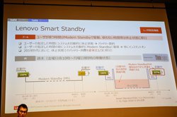 これを改善するために使用しない時間を設定、深夜などはModern Standbyをオフにする「Lenovo Smart Standby」を新たに搭載することで、休止状態でのバッテリー消費を従来から1/3に抑えた。